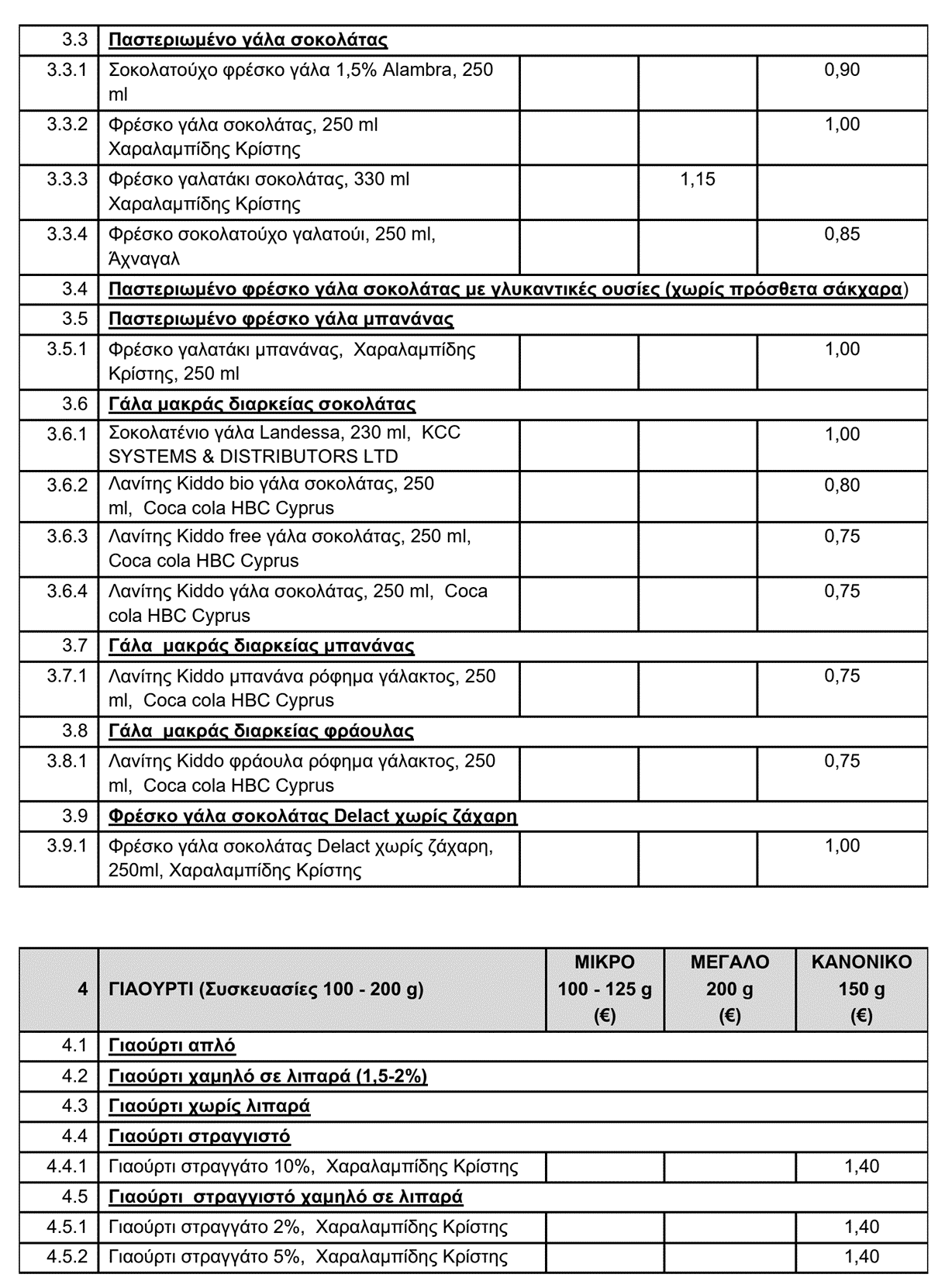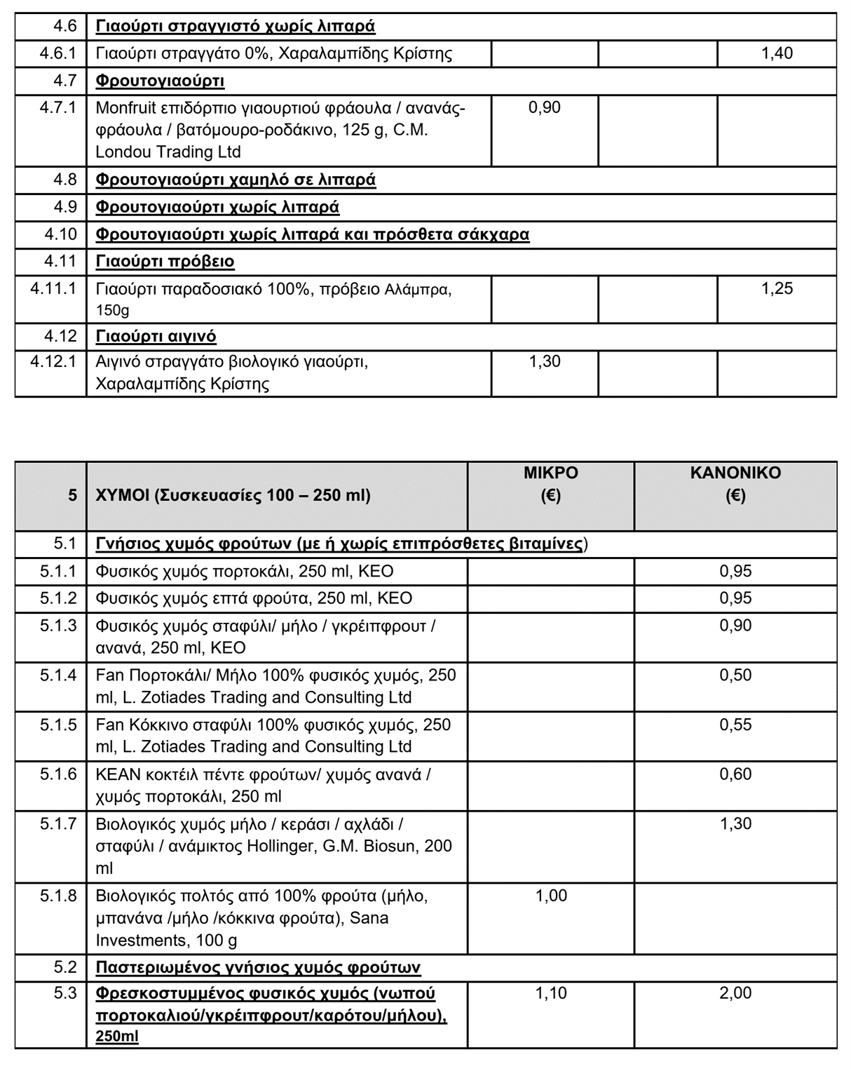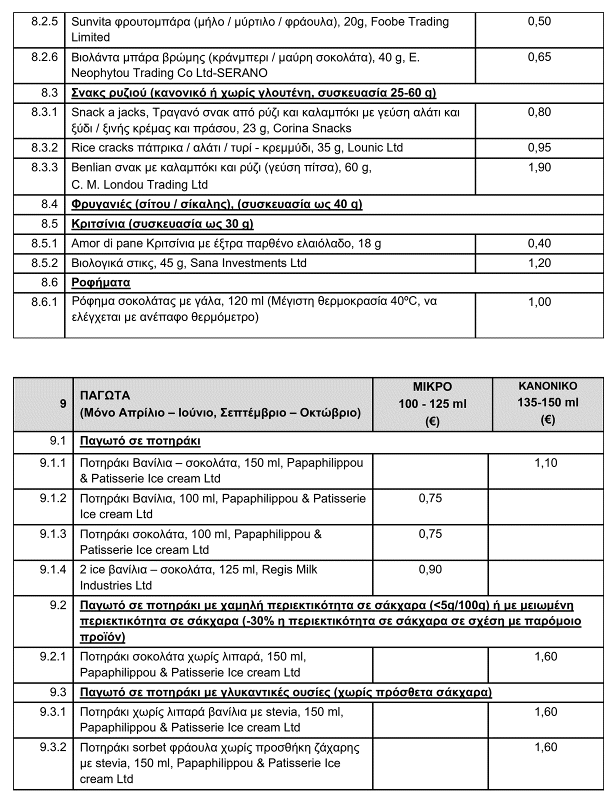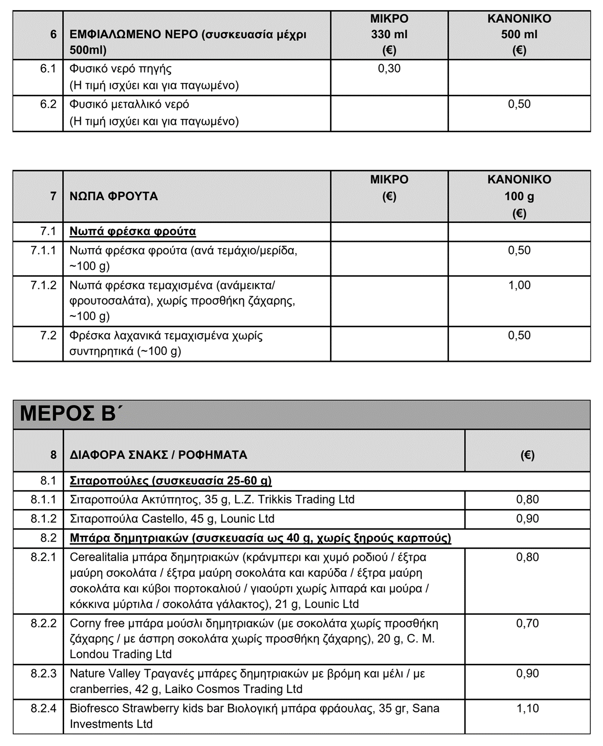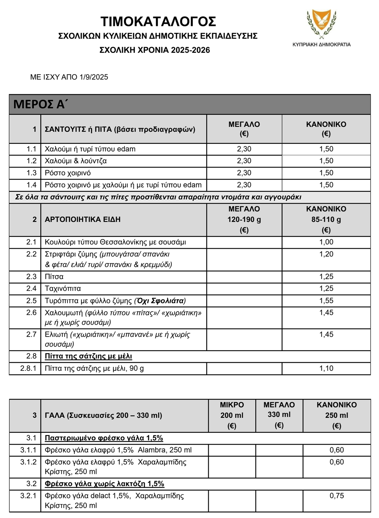 Τα προϊόντα που προσφέρονται προς πώληση από το σχολικό κυλικείο για τη σχολική χρονιά 2025-2026 είναι αυτά που αναφέρονται στον πιο κάτω εγκεκριμένο κατάλογο. |