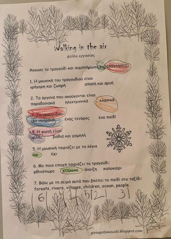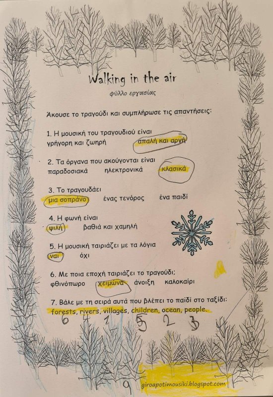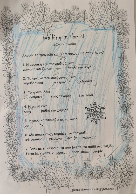 Εβδομάδα 2-9/12/2024: Μουσικό παραμύθι "Ο χιονάνθρωπος/The snowman" (1982), μελέτη τραγουδιού "Walking in the air" Aled Jones και συμπλήρωση φύλλου εργασίας (ερώτηση 7: ανάγνωση λέξεων, έννοια λέξεων και σειροθέτηση τους βασιζόμενοι στην ιστορία του παραμυθιού).